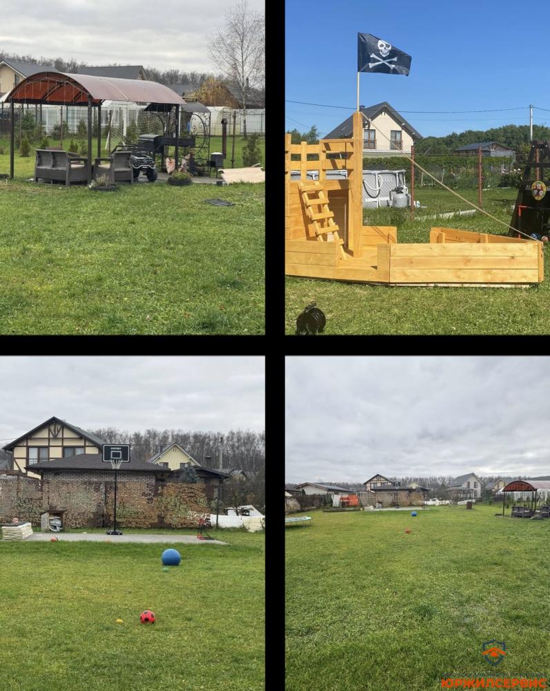 Детская площадка, мангальная зона, терраса 32 кв м, площадка из брусчатки под бассейн + сам бассейн 20 кубов (диаметр 5 м. 122 глубина) и система фильтрации под него