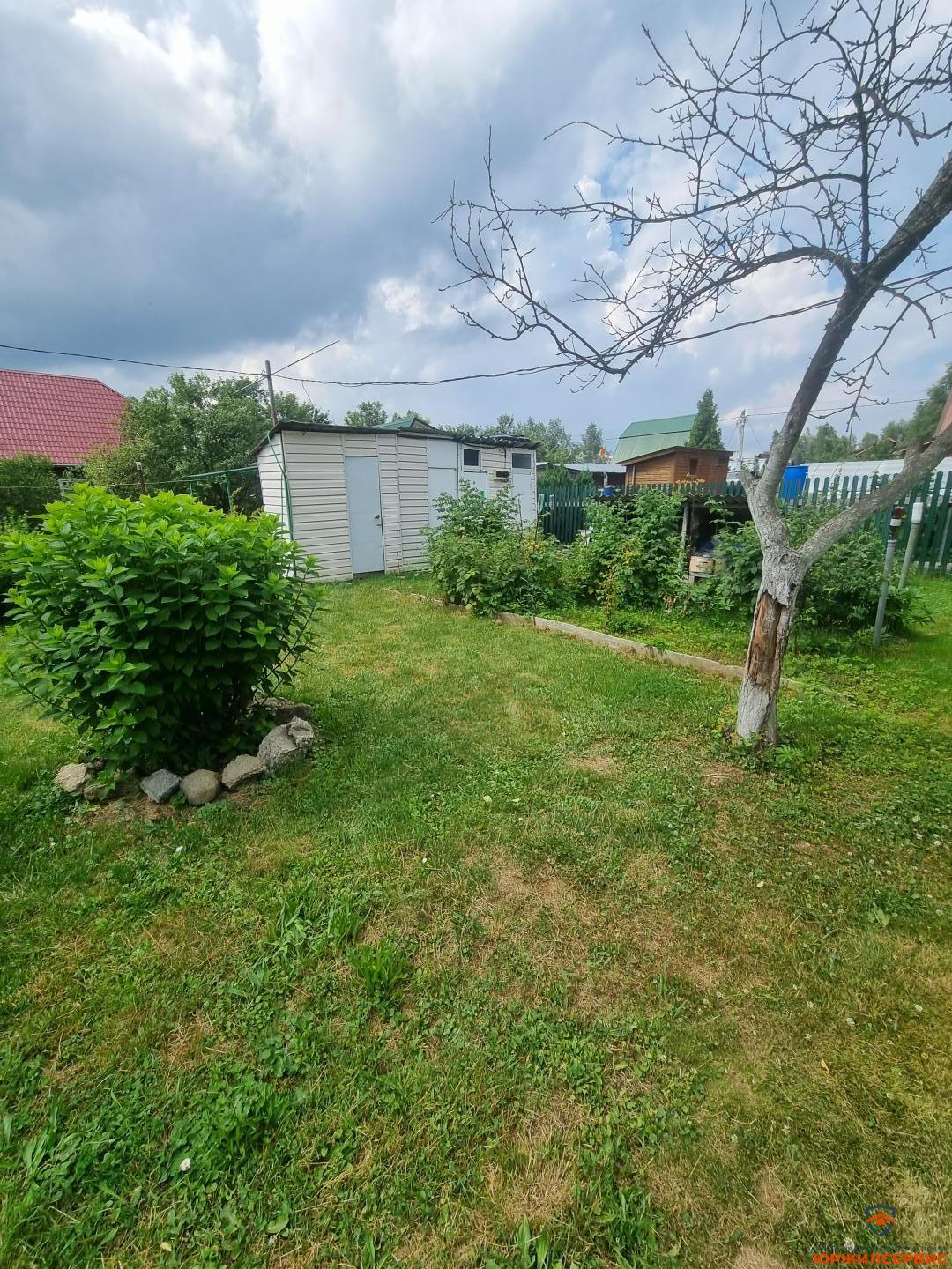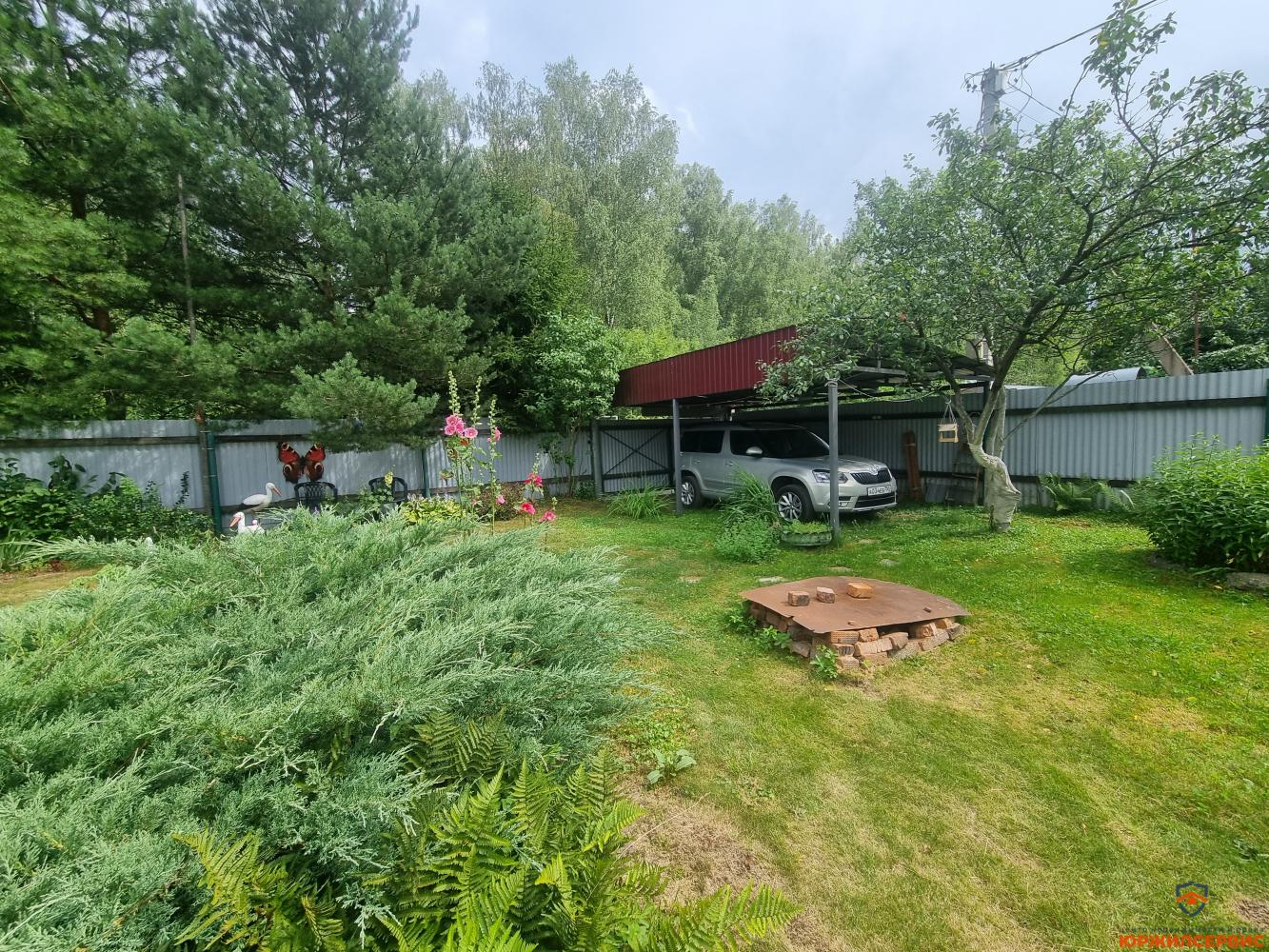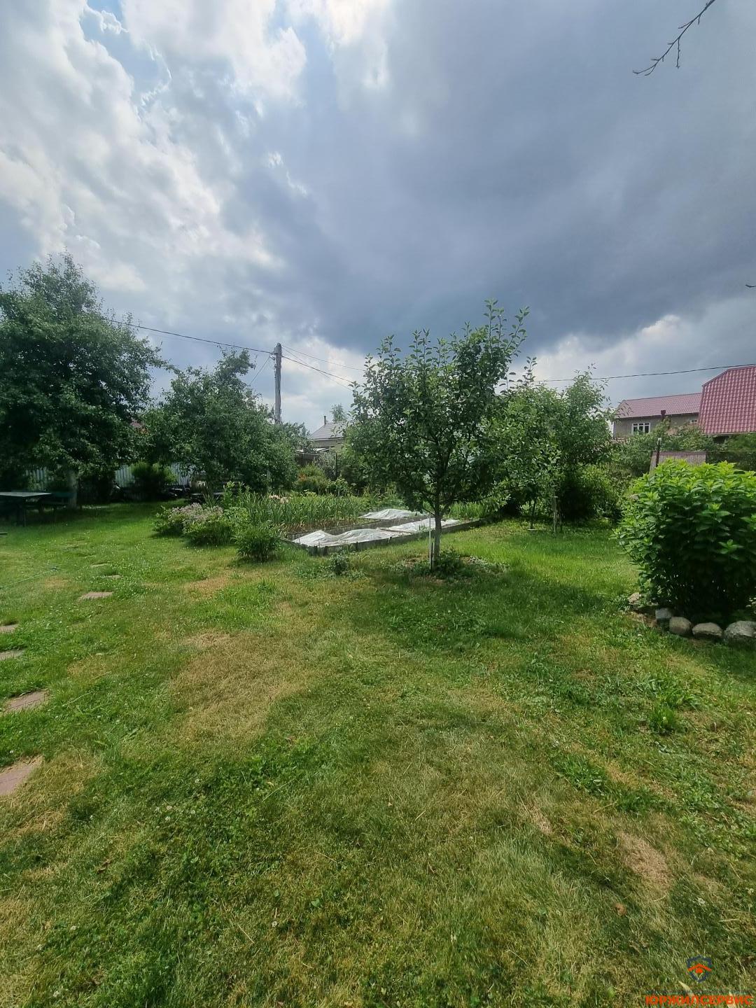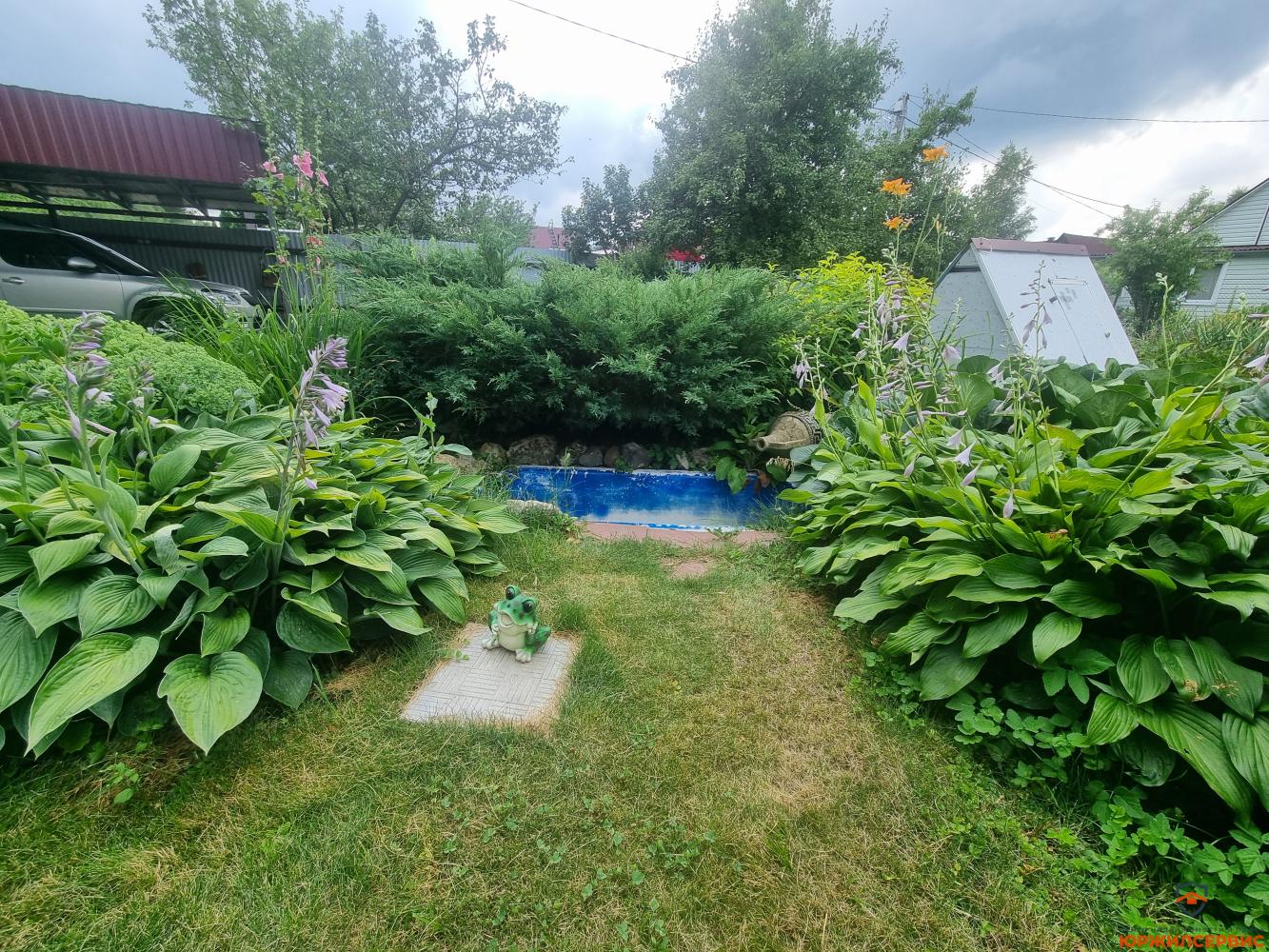 плодовые деревья и кустарники, цветник с декоративным прудом, небольшой огород, столик для пикника под грушей, туалет, душевая, хозблок состоит из двух секций, парковочное место под навесом.